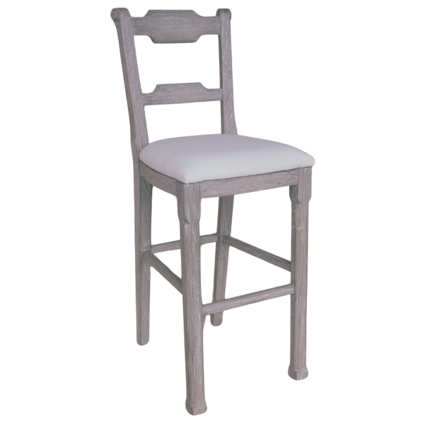 Solid Mahogany wood with neutral poly/cotton seat fabric. Counter seat height is 25″. The seat is easily removed for D-I-Y reupholstering. Hand made and hand painted.